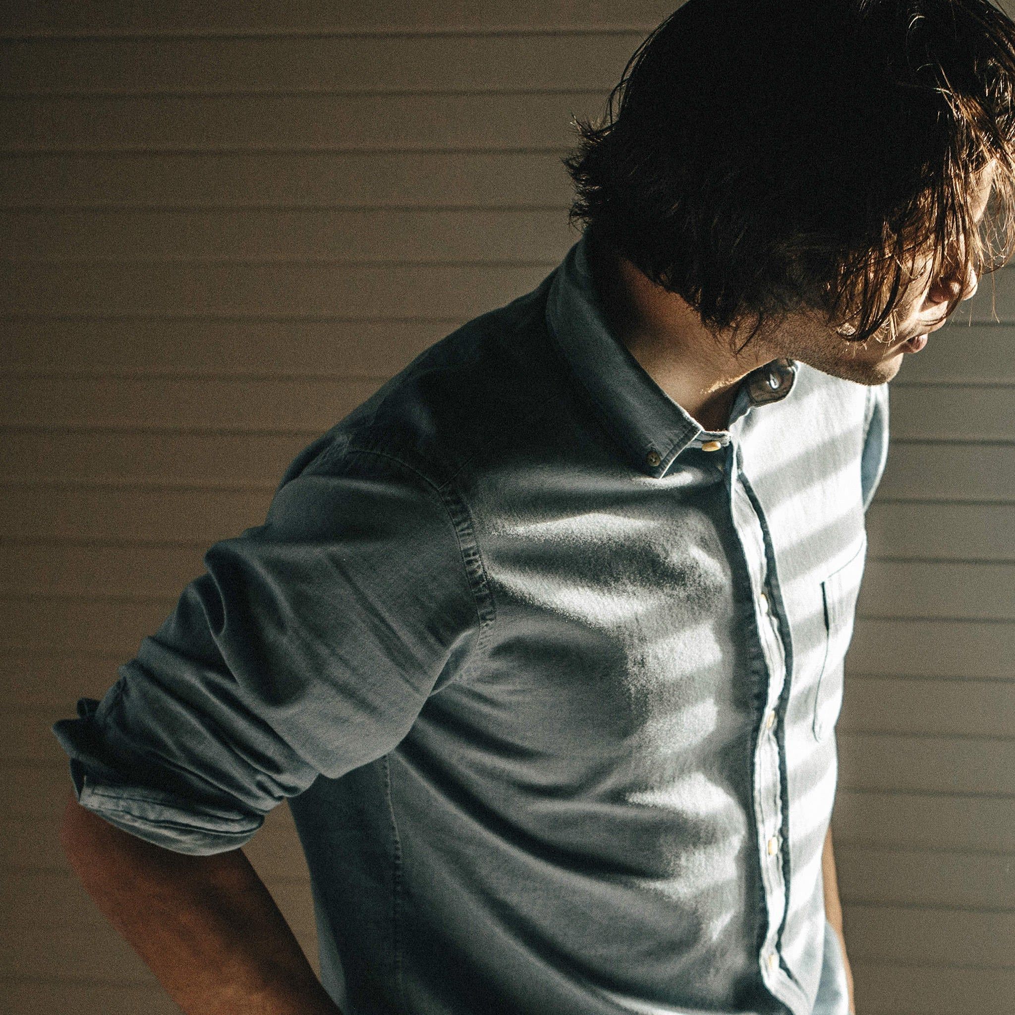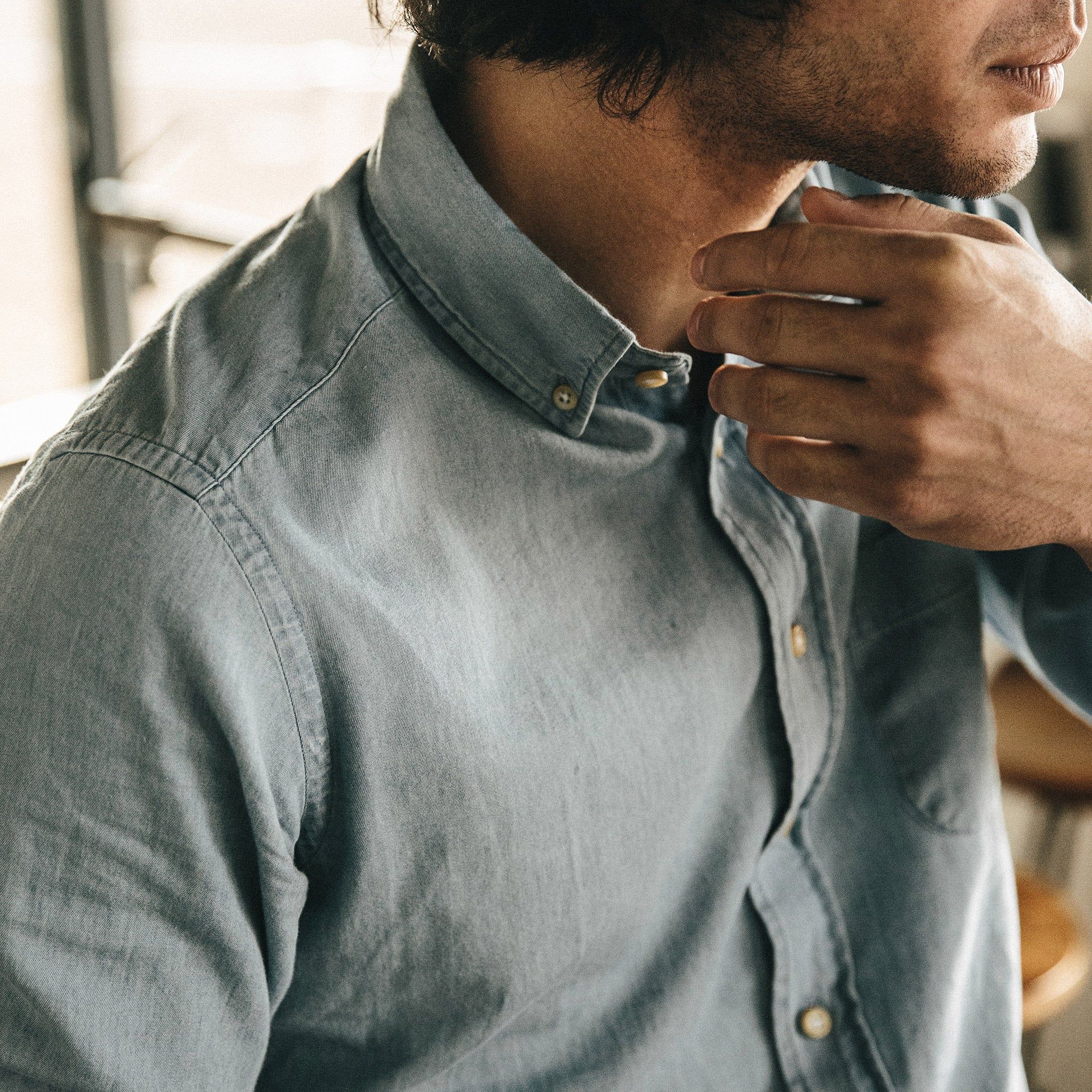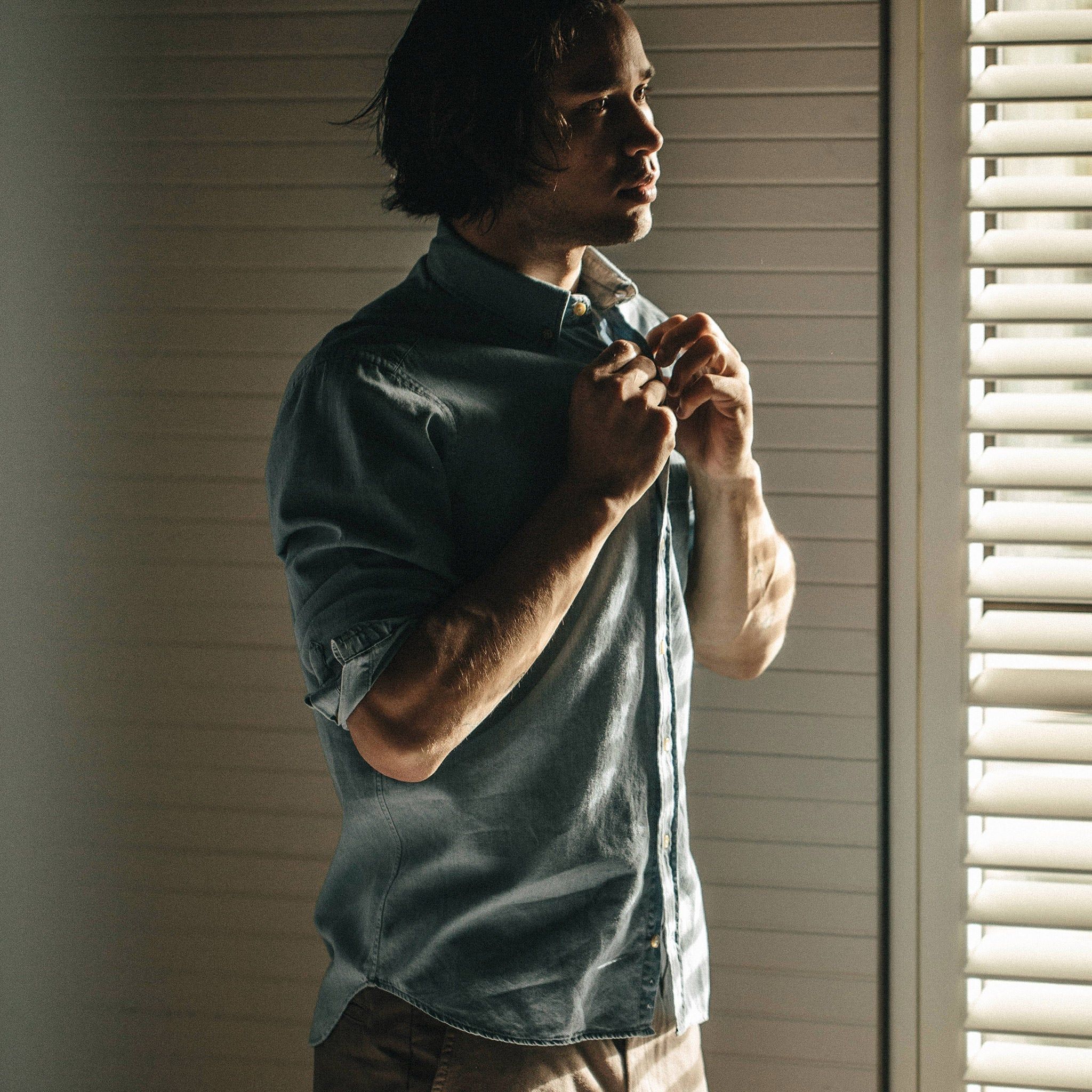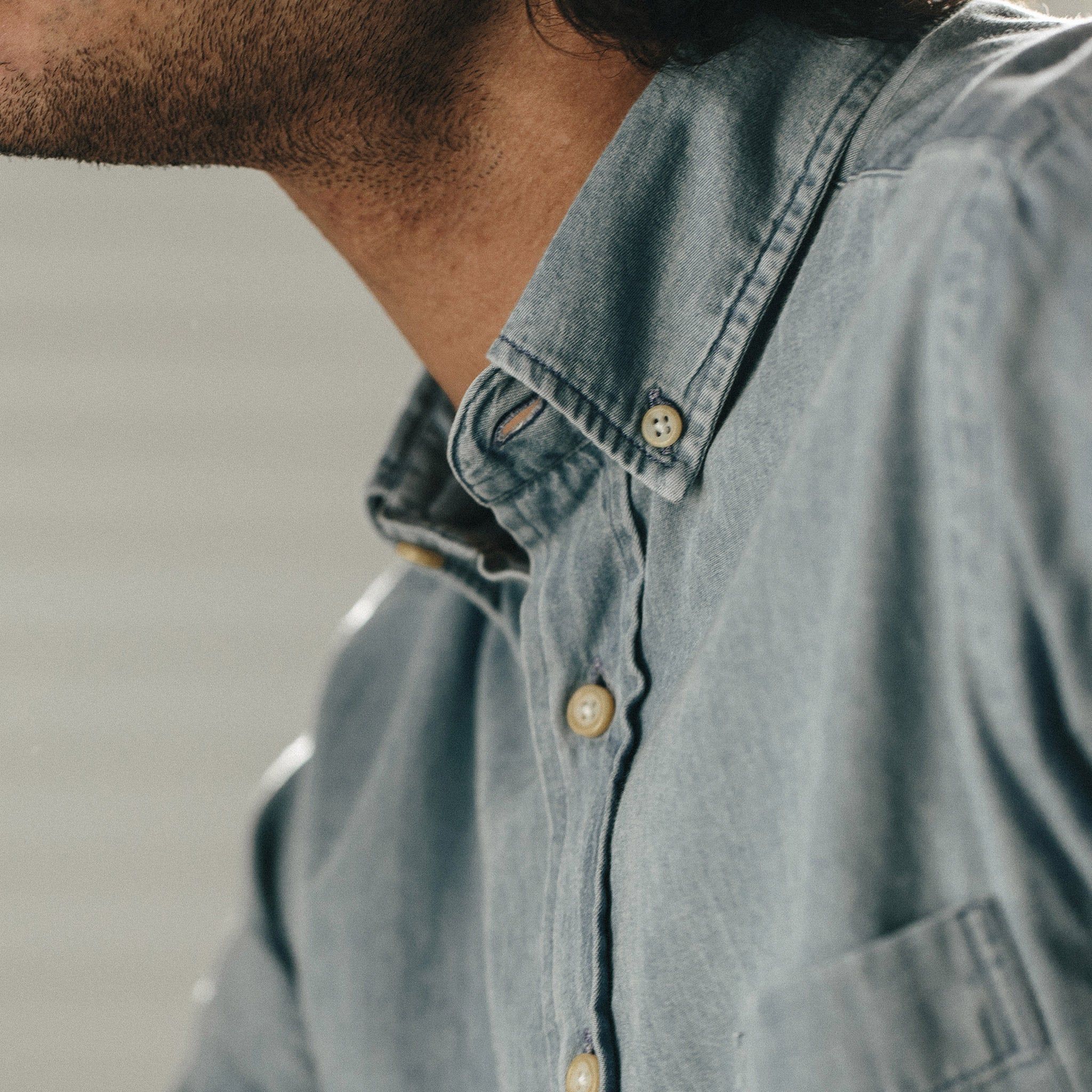 Our staple shirt has a tailored fit with a triple button collar. 7 years in the marking, our oxford comes in a sun bleached denim. In-Stock now.